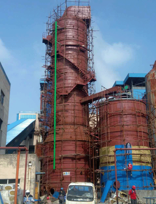 该项目2#脱硫塔和氧化塔封顶后,我公司项目部立即开始内部喷砂除锈玻璃鳞片防腐作业的安排,2#脱硫系统设备安装、管道安装、保温、电仪施工等作业也逐步紧张有序的进行。在确保2#脱硫系统进度的前提下,1#脱硫系统的相关施工工作也已全面开展,脱硫塔、氧化塔、烟道等正在预制施工。